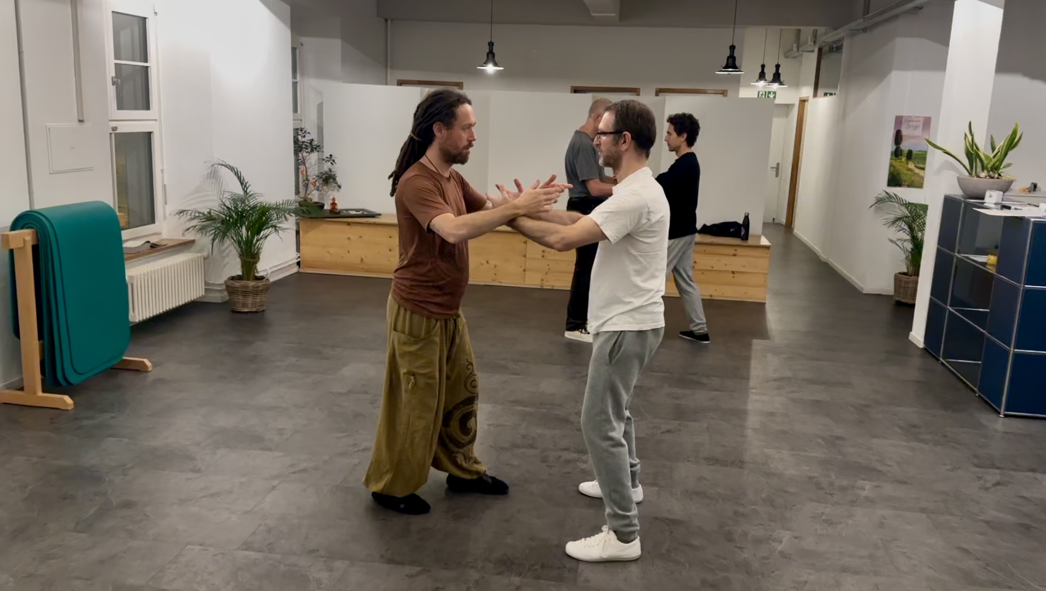Tui Shou ist ein weiterer Baustein von Taijiquan. Man übt sich entspannt, balanciert und geerdet zu bewegen, auch wenn eine äussere Kraft einwirkt. Weitere Informationen zum Tui Shou-Training.